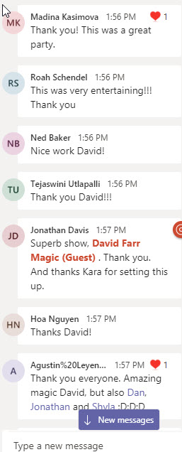 The key to making this fun is interactivity. This is NOT just like watching a YouTube video of a magic show. The participants are an active part of the magic. Check out these quick clips of the fun the virtual magic experience attendees and I have: